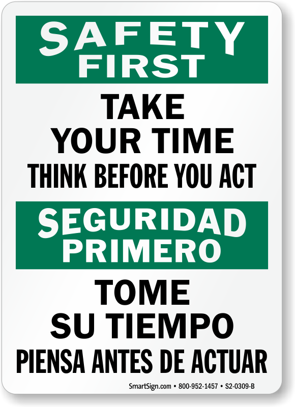 Stop, breathe, think and act! Remind others to be safe by thinking before they act with this bilingual safety first sign.