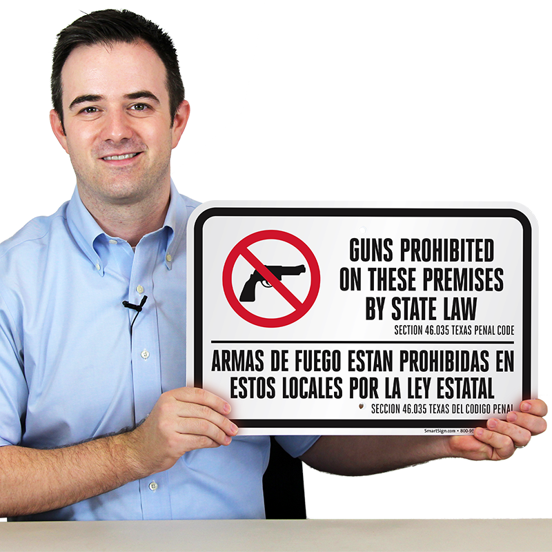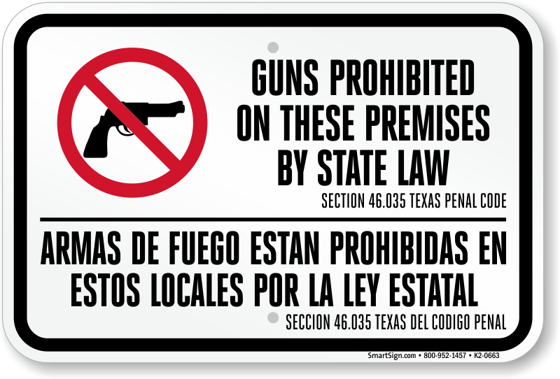 Bilingual Texas Gun Law Sign: Guns Prohibited on these Premises by State Law, Section 46.035 Texas Penal Code K2-0663 Learn More...