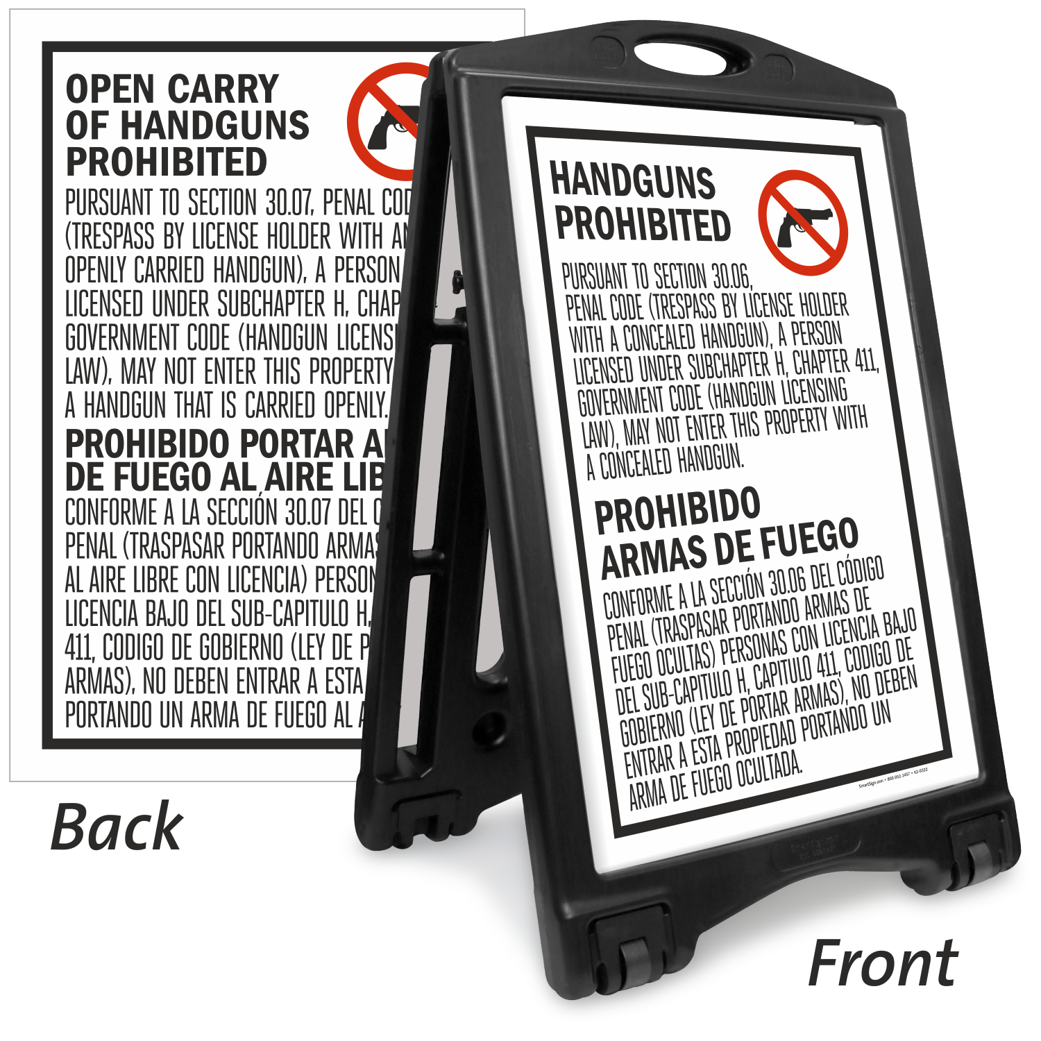 Want a ban on both open and concealed carry of handguns on your property? Use this fully compliant sidewalk sign to secure your rights under Texas Penal Code sections 30.06 and 30.07. Bilingual text on both sides and 1" type, as required by law.