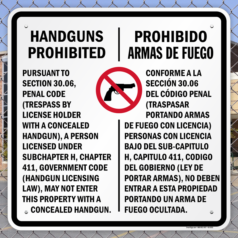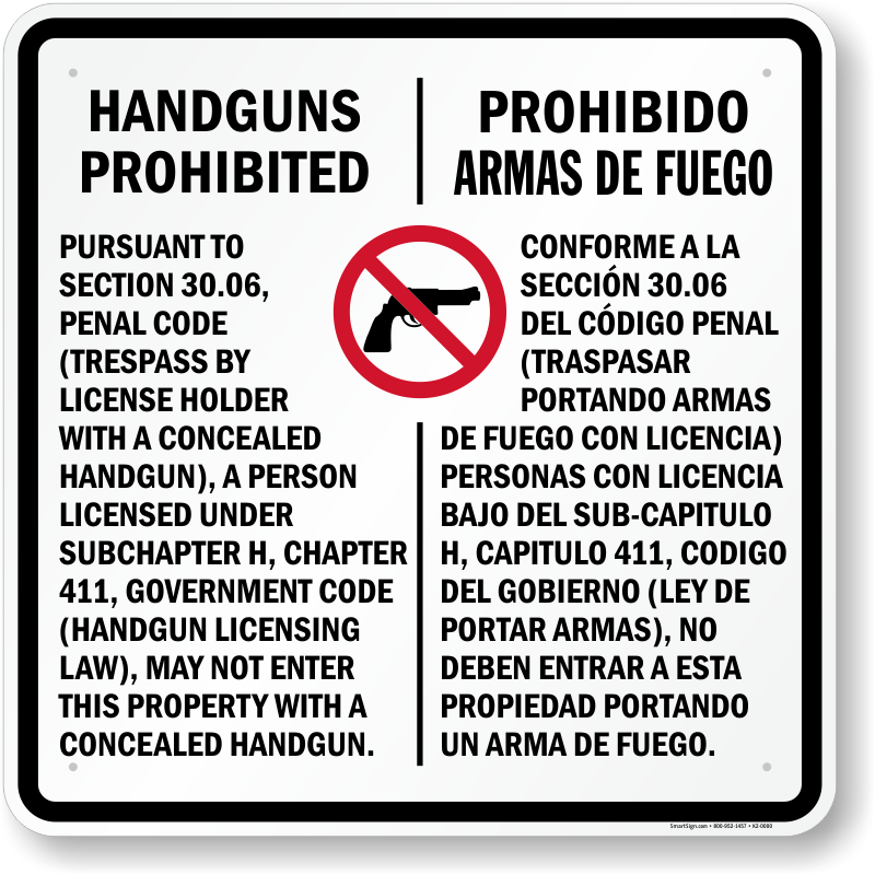Make sure you have Texas's required concealed carry language posted on your property in compliance with the Texas Penal Code Section 30.06. This Texas gun law sign has legally required language printed in English and Spanish, with 1-inch type.