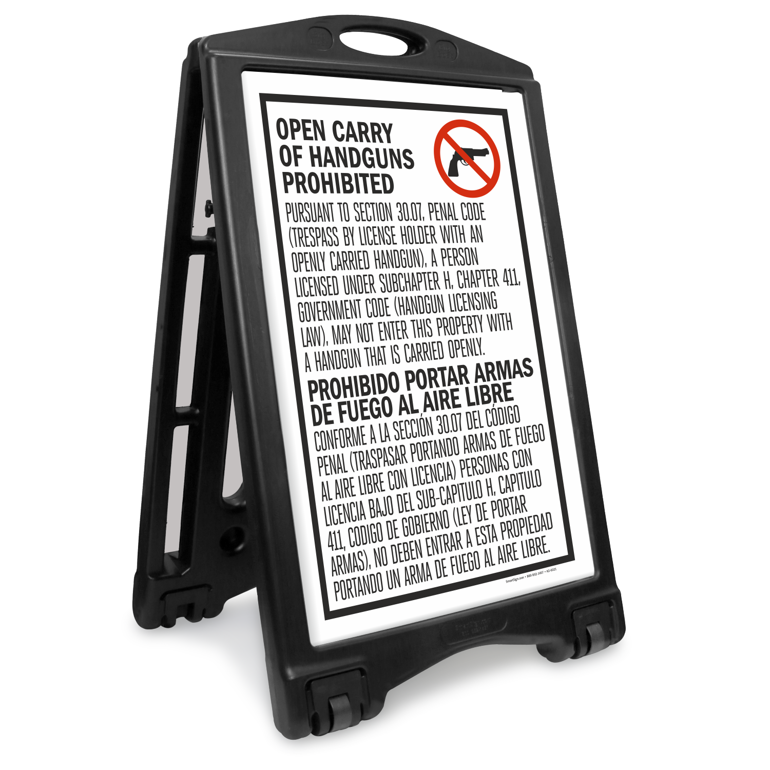 Secure your business by banning open carry of handguns on your property. This portable sidewalk sign with the same bilingual messaging on front and back can be moved to any location where you need entrants to take note of your rules under Texas section 30.07.
