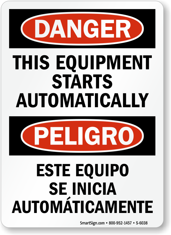 Do not keep workers unaware of hazardous machinery. Post a Bilingual OSHA Danger Sign to inform everyone that This Equipment Starts Automatically.