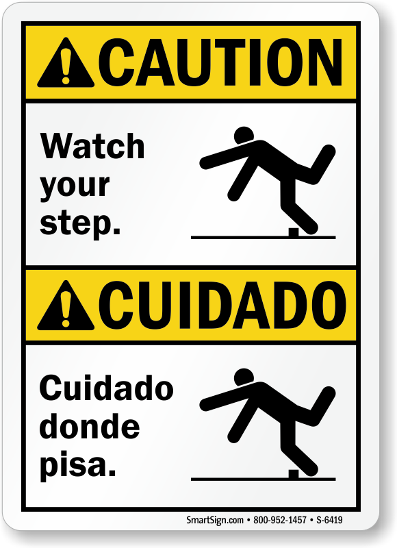 Prevent nasty trips by installing this ANSI bilingual sign that simply advises to be cautious while walking.