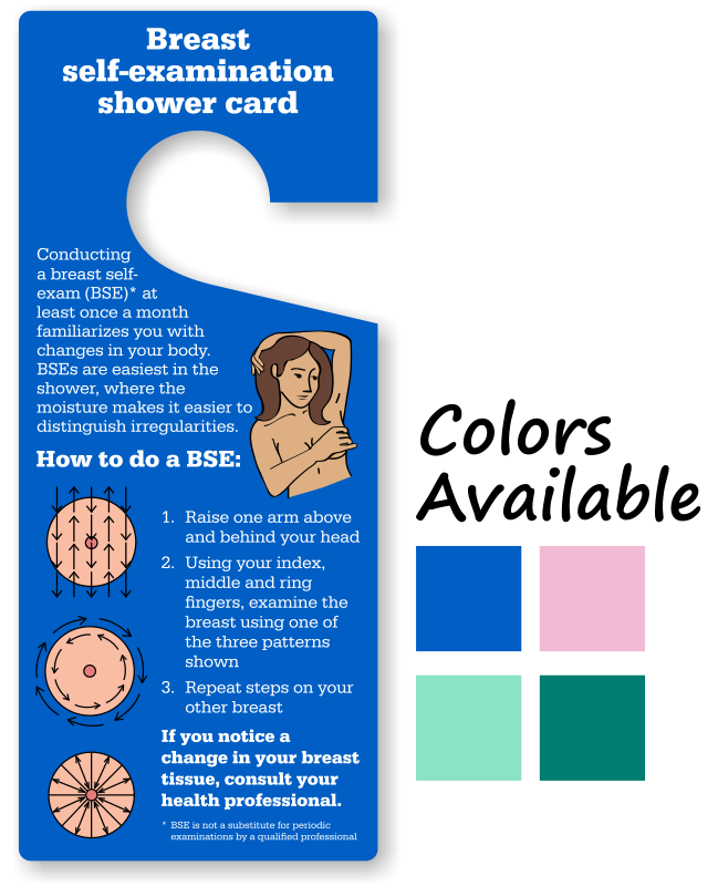 BSE Shower Card Hang Tag is a good reminder to conduct breast self-exams. Hang this waterproof card in your shower, follow the guidelines, and stay fit. Available in four attractive colors.