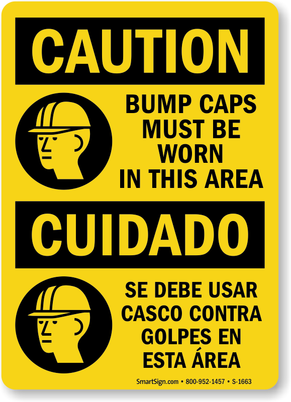 Make sure that workers wear bump caps for head protection before accessing the hazardous area. The best way to communicate this message is by installing this Bilingual OSHA Caution sign in the vicinity.