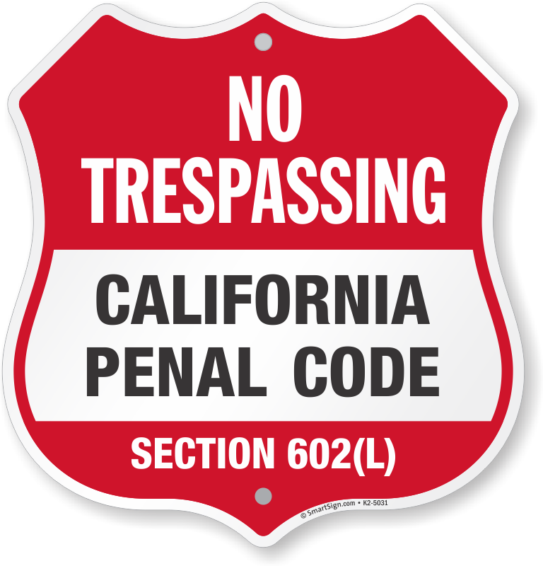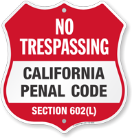 California No Trespassing Shield Sign: California Penal Code, Section 602(L) K2-5031 Learn More...