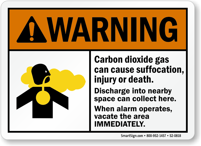 ANSI Warning Sign: Carbon Dioxide Gas Can Cause Suffocation, Injury Or Death - When Alarm Operates Vacate Immediately
