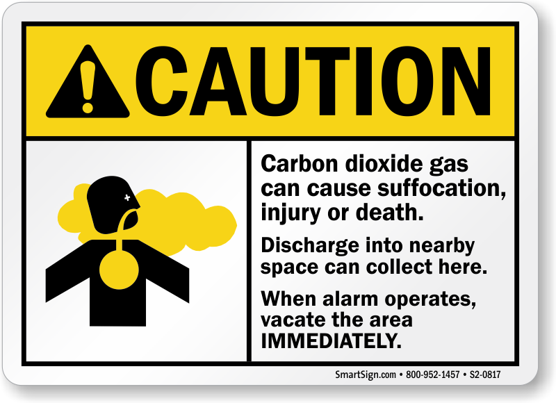 ANSI Caution Sign: Carbon Dioxide Gas Can Cause Suffocation, Injury Or Death, When Alarm Operates Vacate Immediately