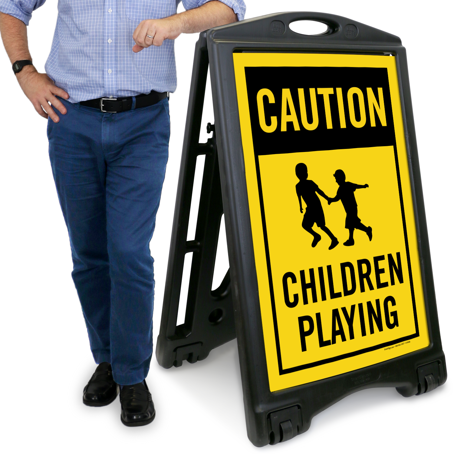 The header 'Caution' with graphic of children playing is enough to make drivers attentive. Portable sidewalk sign can be used at places where kids are playing outdoor games to ensure their safety from traffic.