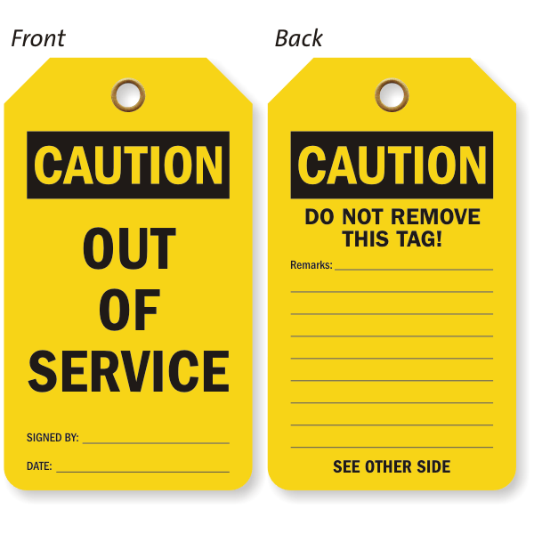 2-Sided OSHA Caution Safety Tag: Out Of Service Tag TG-0617 Learn More...