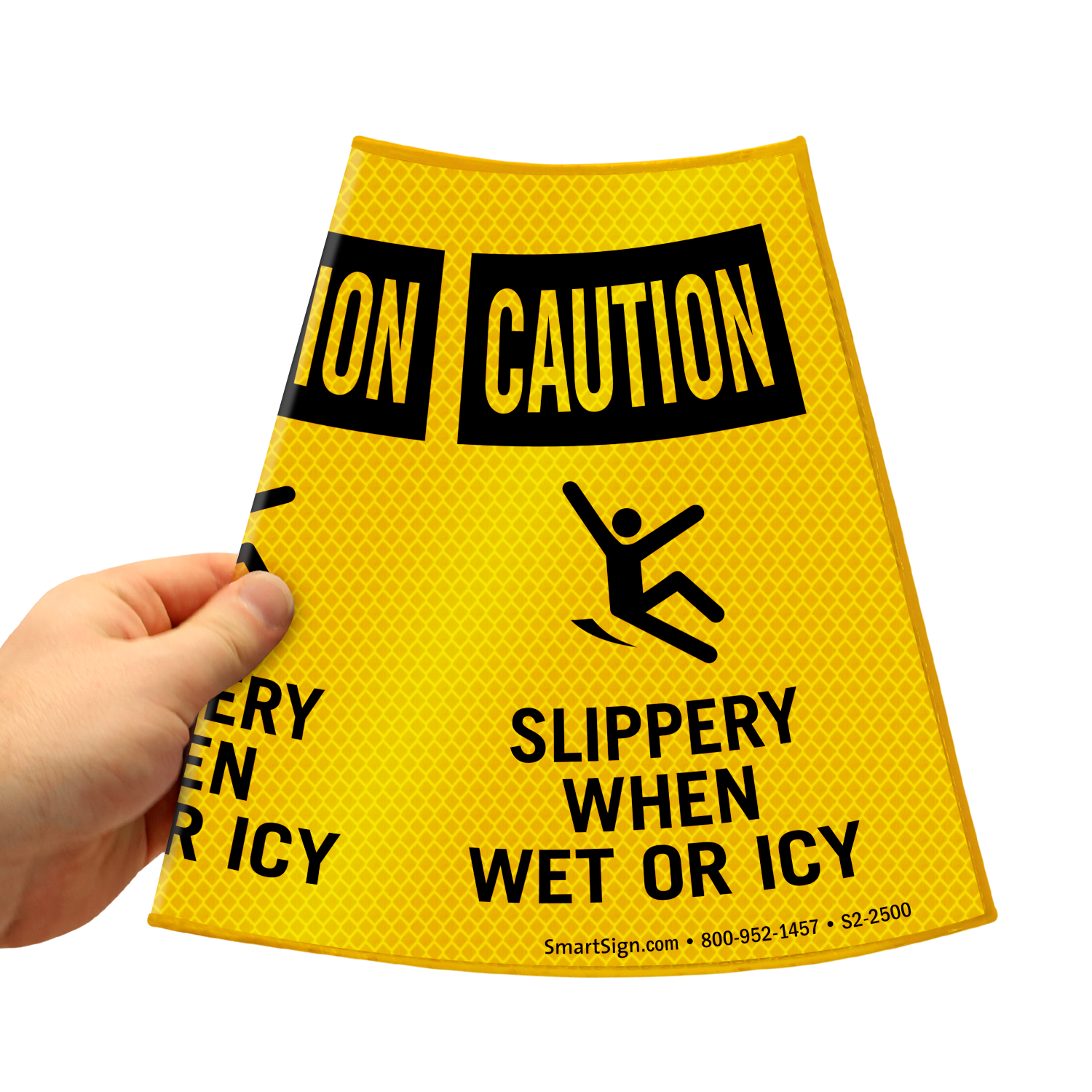 Communicate temporary messages like this effectively through our flexible cone sleeve. Highly visible warning message is printed on three sides of the cone collar.