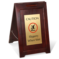 Floor signs deliver important safety and maintenance messages throughout your facility. Add a touch of class with our FloorBoss Elite Floor Signs. Mounted on a wooden frame with brushed brass aluminum sign face, FloorBoss Elite combines durability and elegance in your facility's signage.