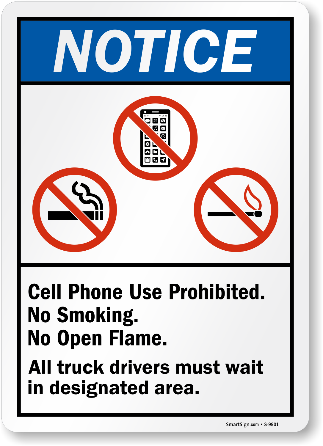 Use this notice sign to prohibit the use of open flames, cell phones and cigarettes, and to inform truck drivers to wait in a designated area.