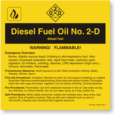 A Diesel Fuel Oil No. 2-D chemical label will help prevent an avoidable and unnecessary accident. Nothing works better to increase safety than a Diesel Fuel Oil No. 2-D label.