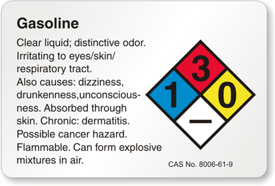 Gasoline NFPA label helps you display all the characteristics and effects of exposure in order to facilitate proper diagnosis and emergency treatment. Use of effective chemical labels decrease the chances of injuries and encourage safety.
