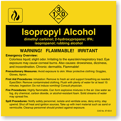 A Isopropyl Alcohol chemical label will help prevent an avoidable and unnecessary accident. Nothing works better to increase safety than a Isopropyl Alcohol label.