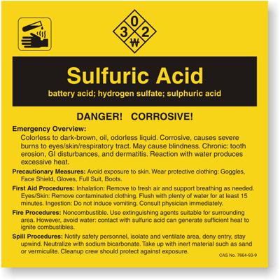 A Sulfuric Acid chemical label will help prevent an avoidable and unnecessary accident. Nothing works better to increase safety than a Sulfuric Acid label.