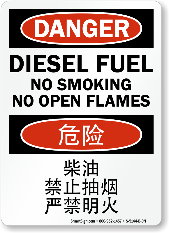 Prevent the chance of accidents and prohibit employees from smoking around the diesel fuel. For a workforce that communicates in English and/or Chinese, deploy this Bilingual OSHA Danger sign.