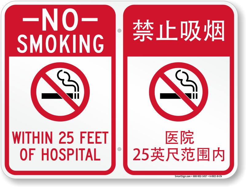 Bilingual Smoking Prohibited Sign: No Smoking - Within 25 Feet Of Hospital with Symbol (Chinese + English) K-0921-B-CN Learn More...