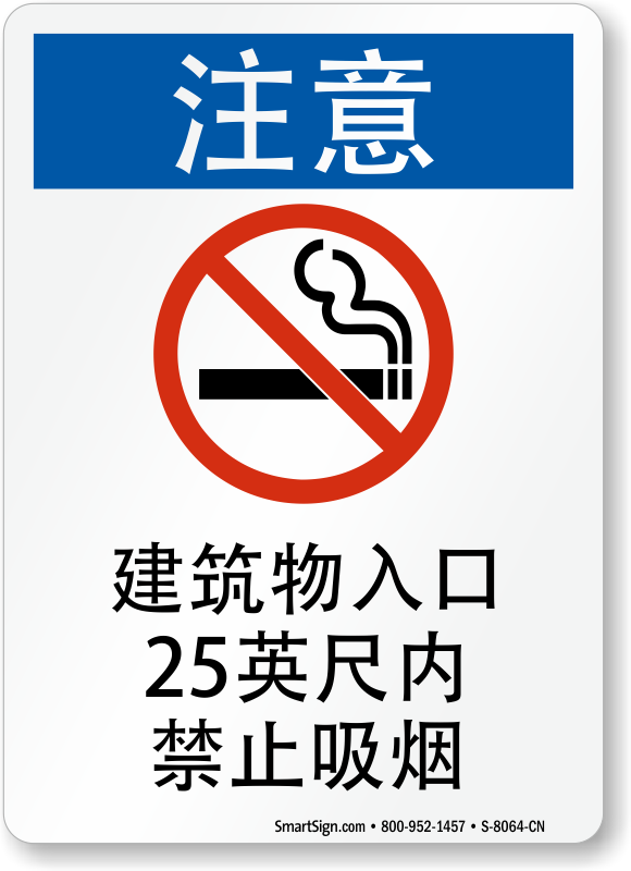 Don't let Chinese speaking workers miss out on an important message in your facility due to a language gap. This Chinese OSHA Notice sign instructs against smoking within 25 feet of the building entrance.