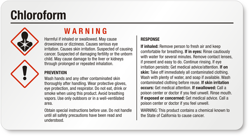 Display all details about the harmful effects of Chloroform if inhaled or swallowed, with our GHS Chemical Label.
