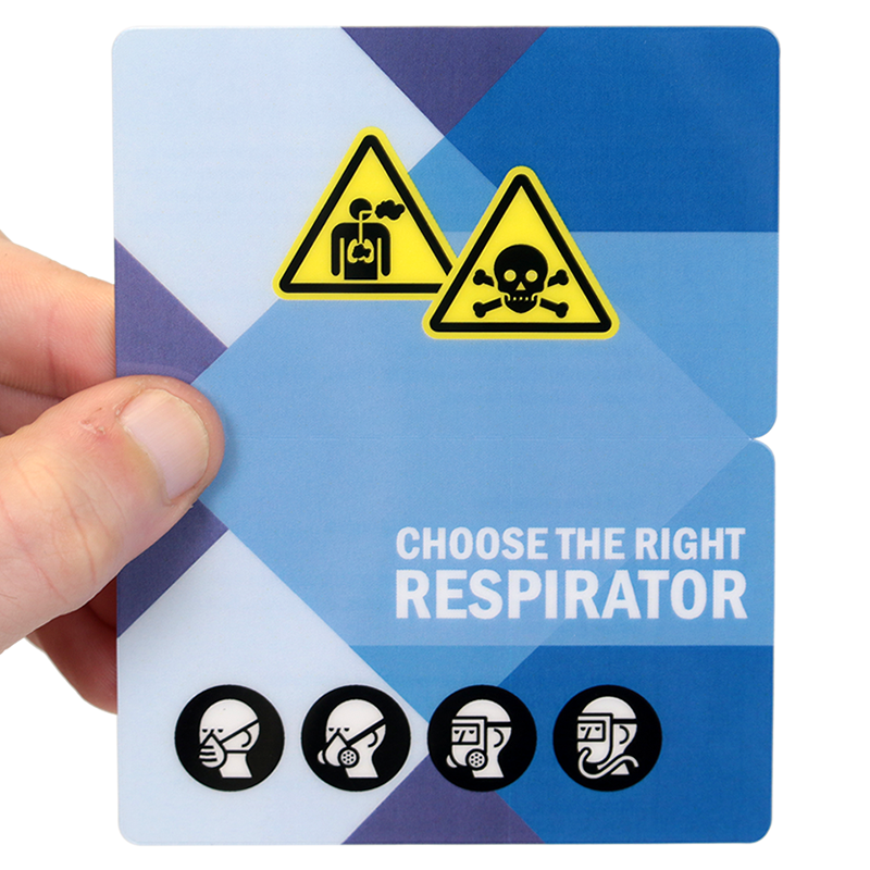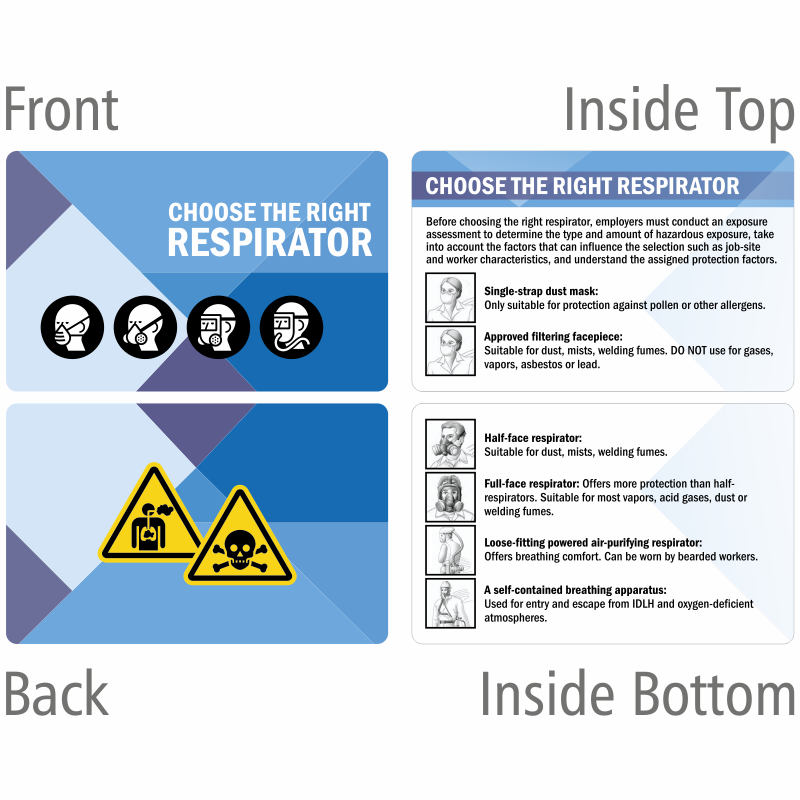 - Bi-Fold Wallet Card stores enormous amount of safety information within. Different kinds of respirators are listed with their images and description in the inner fold of the wallet card.