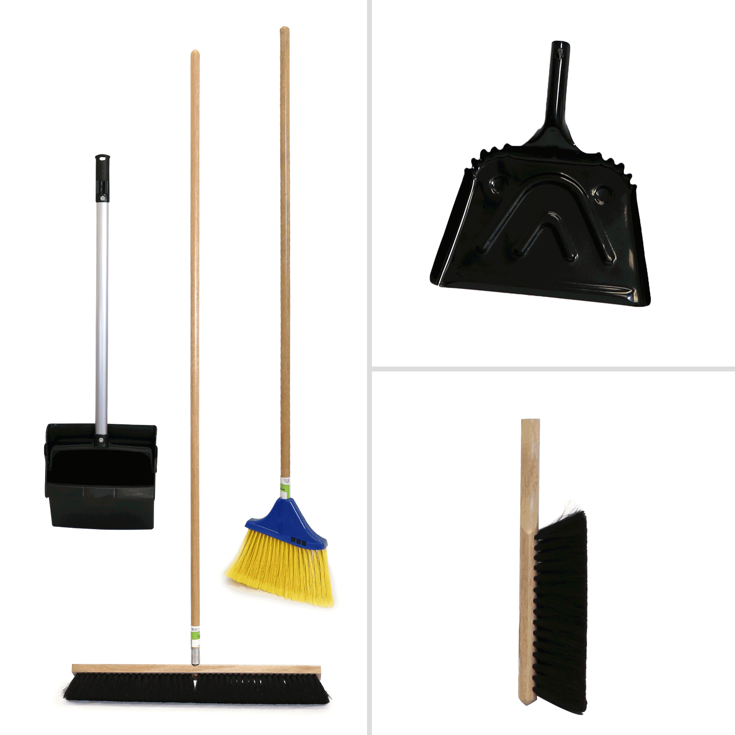 - The kit includes cleaning tools (metal dust pan, lobby dust pan, 24” push broom with 60” handle, 8” bench brush, and angle broom with wood handle), and zinc-plated hook hardware for hanging tools.