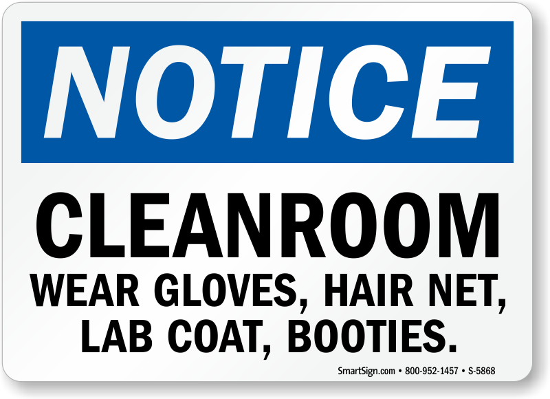 Control the level of contamination in your cleanroom by listing out your requirements. Instruct all workers to wear gloves, hair nets, lab coats, booties with this simple yet effective OSHA Notice Sign.