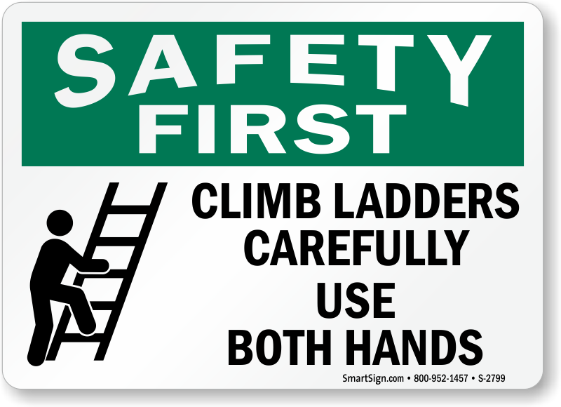 OSHA Safety First sign cautions everyone to climb ladders carefully and to use both hands for support. Clear graphics increases the visibility your message.