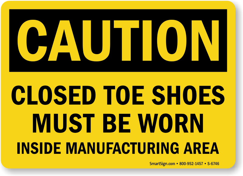 Ensure that all workers wear closed toe shoes in the manufacturing area. Install this high visibility OSHA Caution PPE Sign as a constant reminder for all.