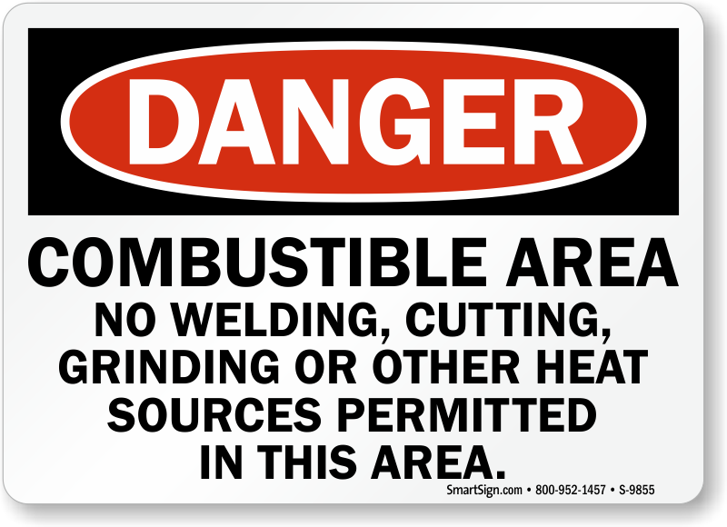 One must be especially cautious in a combustible area. Use this danger sign to remind people not to weld, cut, grind, or have other heat sources in the area.
