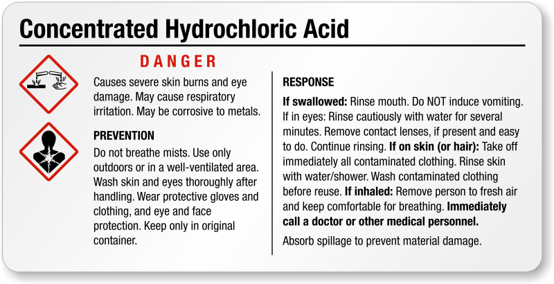 Your workers need to be armed with correct information while they deal with hazardous chemicals. A Concentrated Hydrochloric Acid Small GHS Chemical Label helps you display its harmful effects, properties, and steps for immediate remedy.