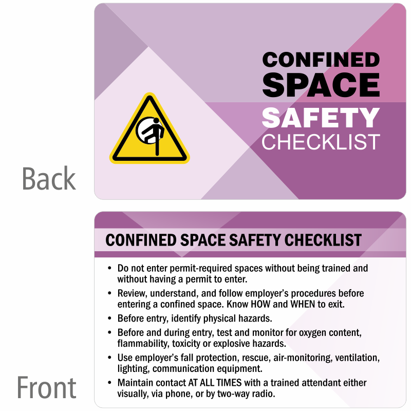 Plastic Card displaying Confined Space Safety Checklist fits snuggly in your wallet.