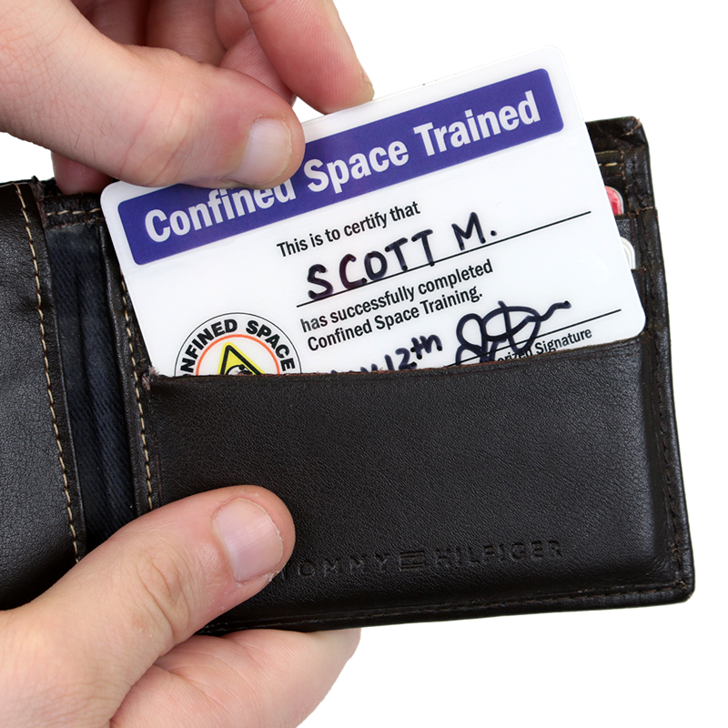 Use this double-sided certification wallet card to display your employees' credentials when they complete their confined space training. Self-lamination seals-in and protects your writing. Durable plastic material is receptive to permanent marker, pen or pencil.