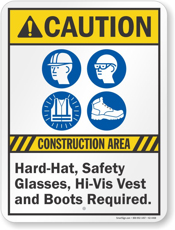 ANSI Caution Sign: Construction Area - Hard Hat, Safety Glasses, High-VIS Vest And Boots Required Learn More...