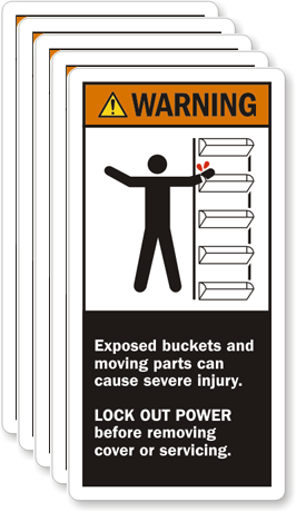 6in. x 3in. Laminated Vinyl Labels: Warning - Exposed Buckets And Moving Parts Can Cause Severe Injury L-0183-VS