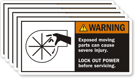 2.5in. x 5in. Laminated Vinyl Labels - Set Of 5: ANSI Warning - Exposed Moving Parts Can Cause Severe Injury Lock Out Power Before Servicing L-0171-VS