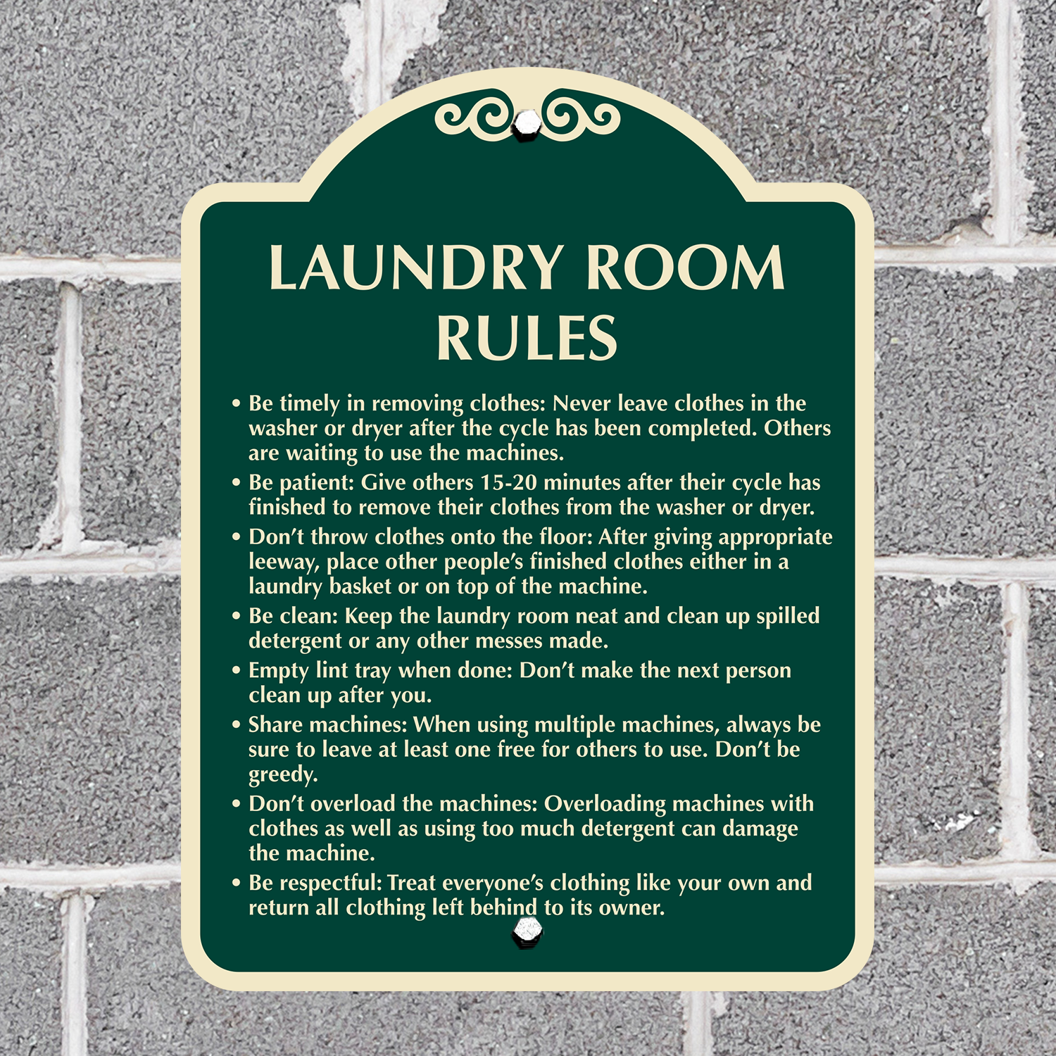 This sign looks so professional in my laundromat. Sometimes you can have too many signs on the wall and no one reads them. This sign draws your attention the minute you walk in the door. I received it so fast. I couldn't wait to put them up.
