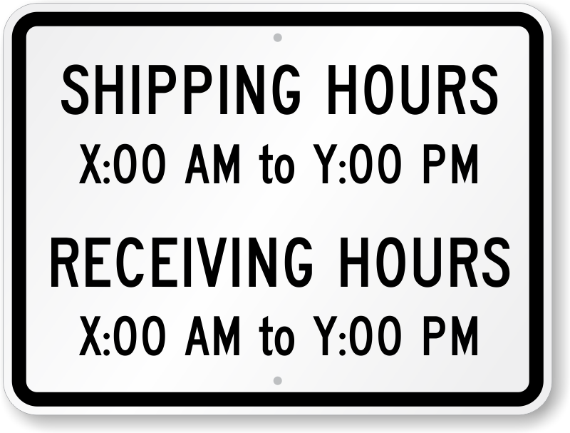 Inform everyone of your shipping and receiving hours. Customize sign for text, time, day at no additional charges. Order and mount this sign at your shipping and receiving dock to save time and organize your loading area.