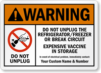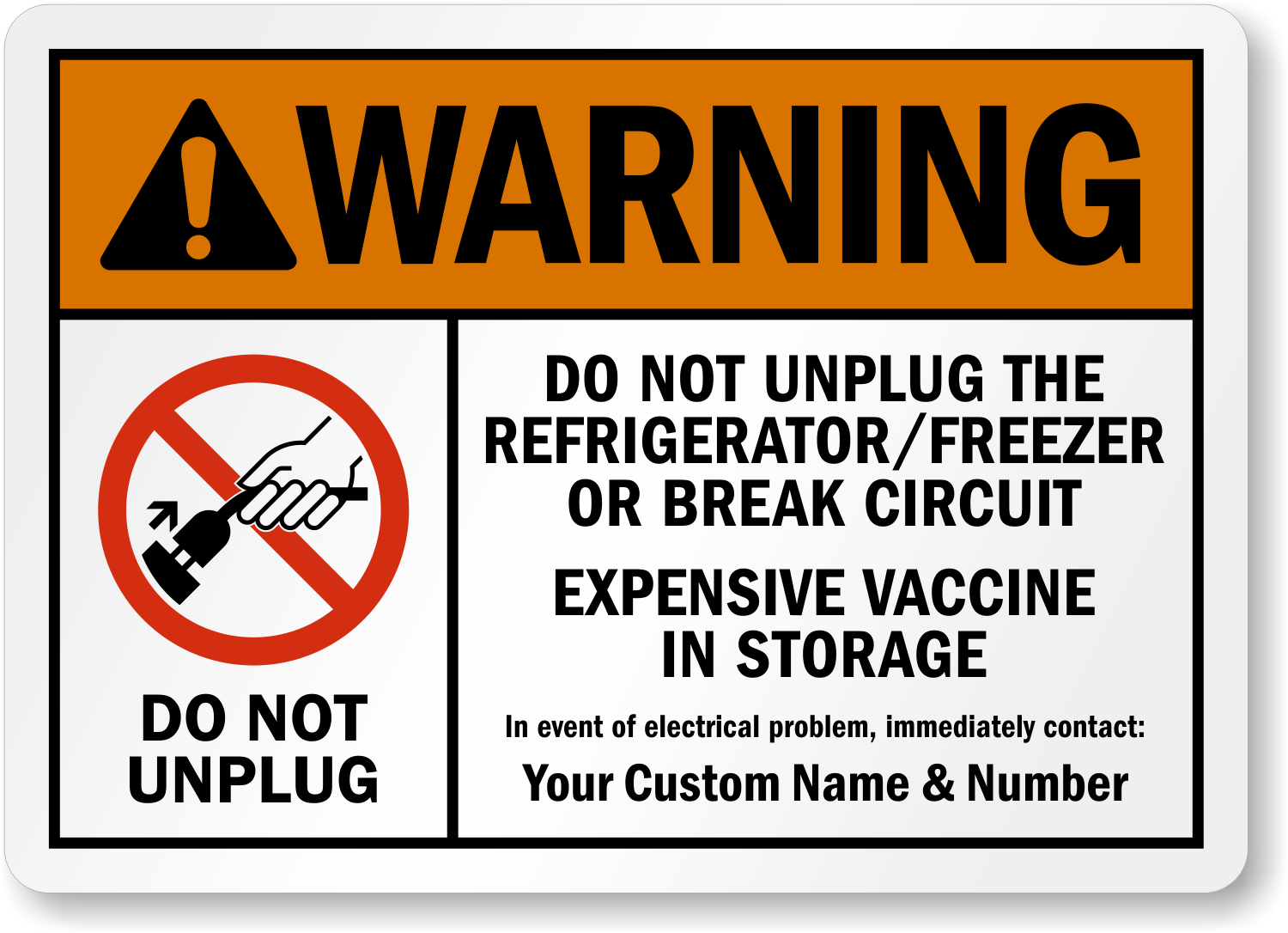 Post up this warning sign to remind employees there's an expensive vaccine in storage and the refrigerator or freezer must not be unplugged!