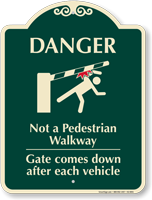 24 in. x 18 in. SignatureSign: Danger, Not a Pedestrian Walkway, Gate Comes Down after Each Vehicle (with Graphic) Learn More...