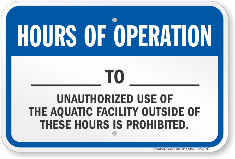 Delaware Pool Sign: Hours Of Operation - Unauthorized Use Of The Aquatic Facility Outside Of These Hours Is Prohibited S2-2169 Learn More...