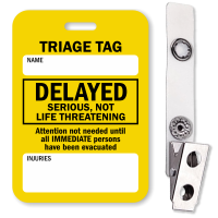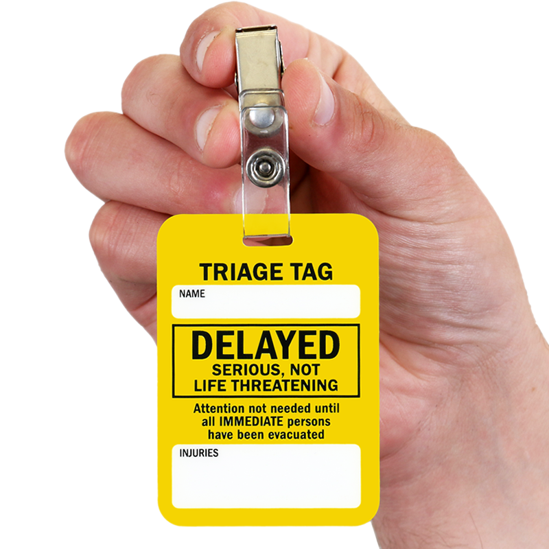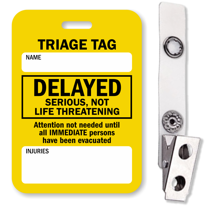 This bright yellow Delayed Triage Tag helps identify victims who are serious and need medical attention, only after those who need 'immediate' help.