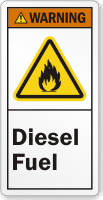 With a symbol of flame this label identifies diesel fuel in the facility so that employees are aware of its location and avoid smoking or any fire related activity within the vicinity.