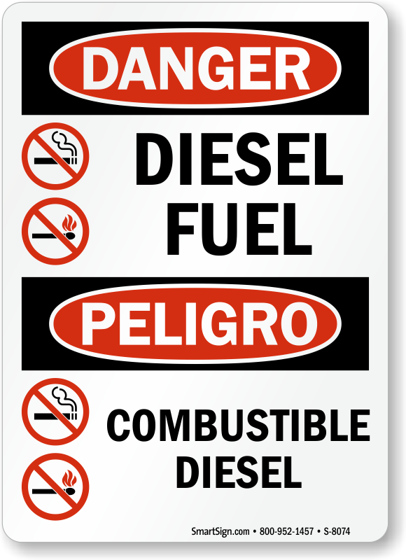 Post your 'No Smoking', 'No Open Flames' message in English and Spanish near diesel fuel storage in your facility.