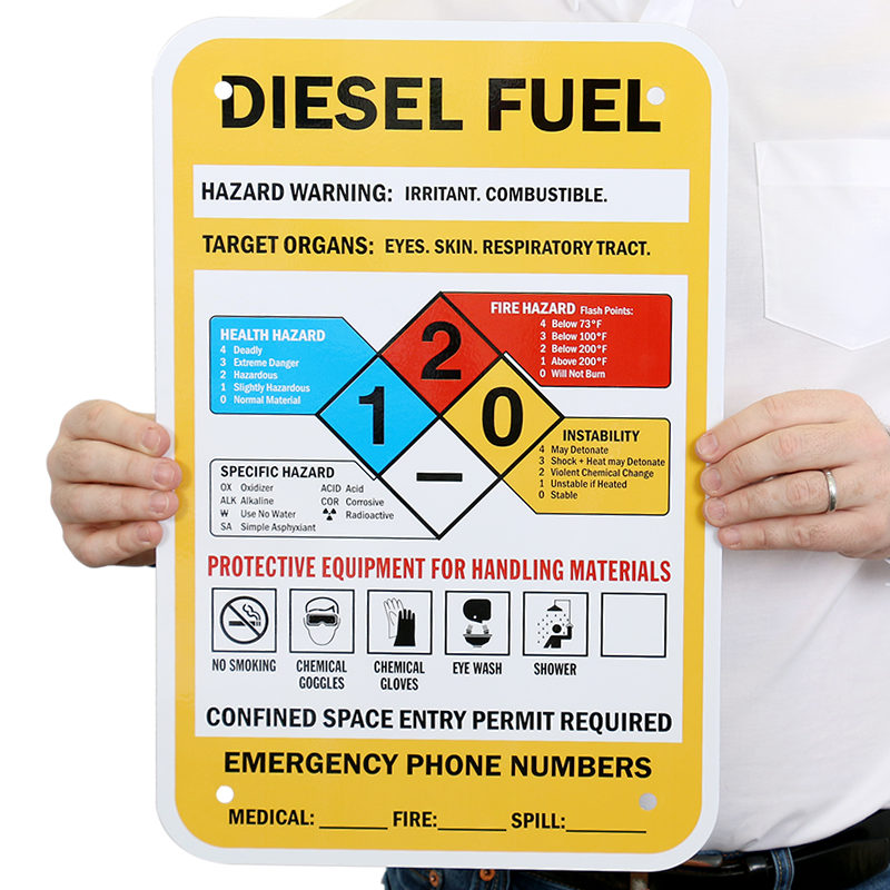 Install this hazmat identification guide sign in diesel fuel storage areas so that employees know how to handle the material safely. The guide is highly informational and underlines specific safety measures. Made of rigid and durable materials, this product withstands harsh chemical abuse and abrasion.
