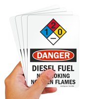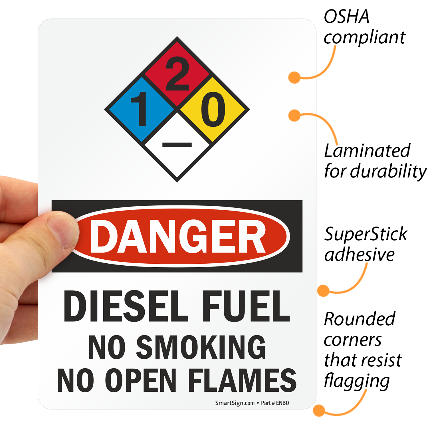 OSHA Danger Diesel Fuel No Smoking or Open Flames sign feature the NFPA hazcom system to alert your facility of this potential risk. This sign features NFPA rating 1 for the health hazard (blue diamond), indicating there is a slight health risk.