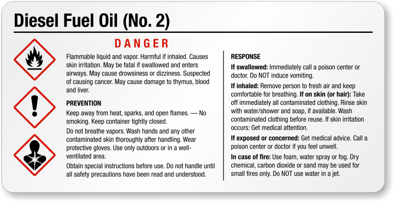Emphasize on safety and adhere to Globally Harmonized System of labeling Diesel Fuel Oil (No. 2) with our small Danger GHS Chemical Label.