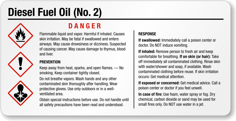 Don’t cut down on displaying essential information. Use a tiny GHS Chemical Label to include all safety information about Diesel Fuel Oil (No. 2) for better identification and handling of materials.