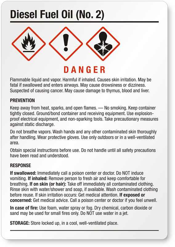 Diesel Fuel Oil (No. 2) GHS Label - Medium: Chemical Danger - Flammable Liquid And Vapor, Harmful If Inhaled GHS-005-B Learn More...